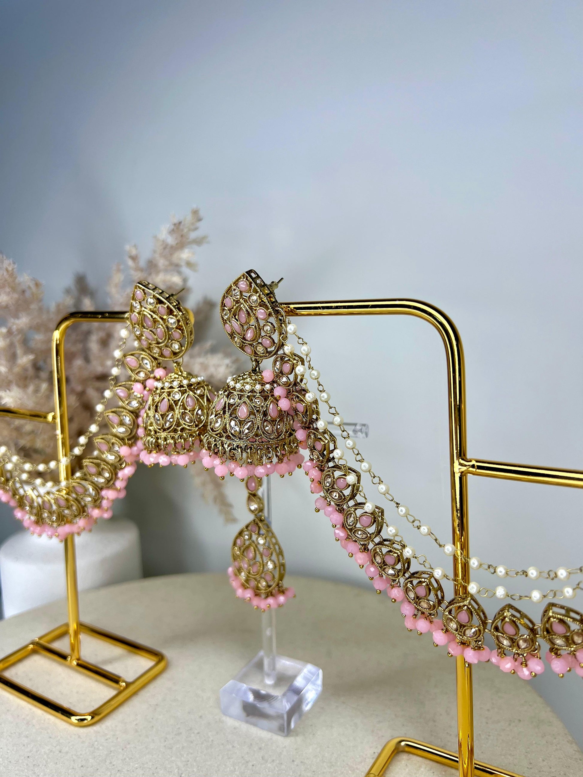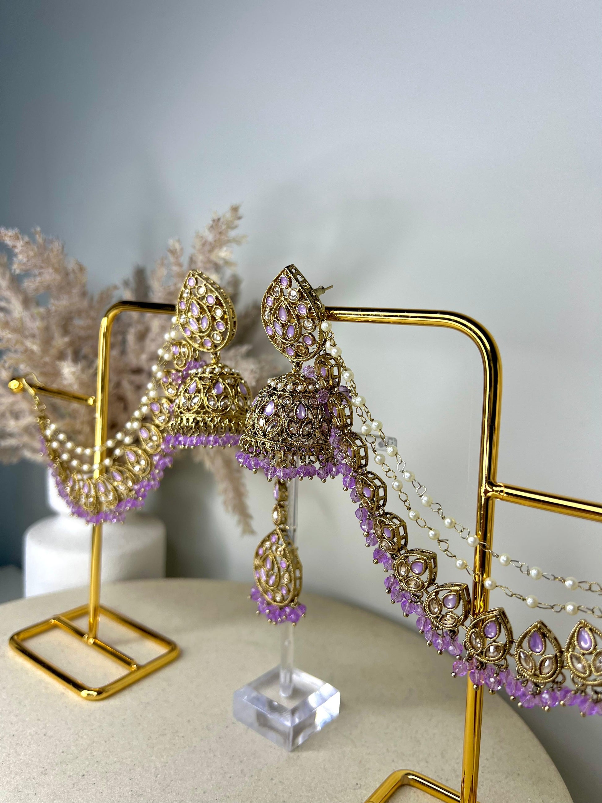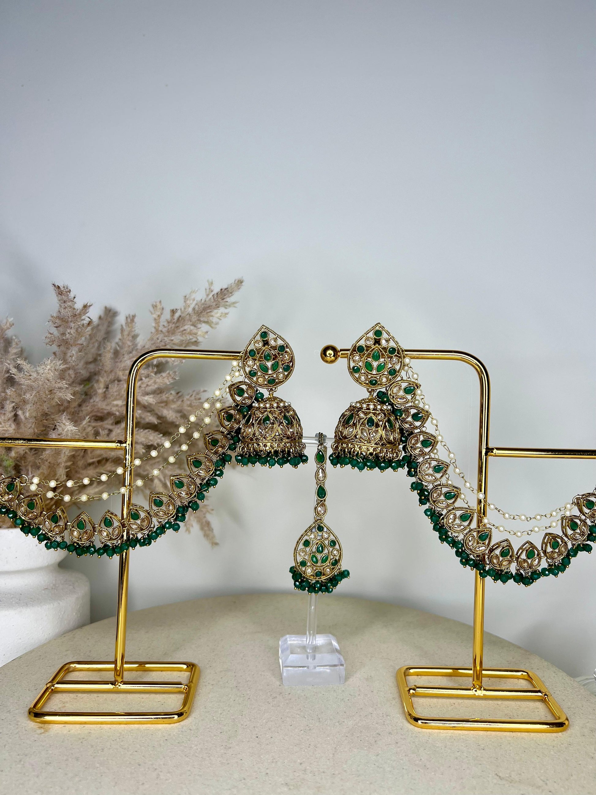 Turn heads with this elegant gold-toned jhumka and tikka set, beautifully embellished with shimmering Polki stones. The traditional jhumkas feature attached saharas that clip securely into your hair, adding both support and a graceful drape. Perfect for bridal wear, festive occasions, or cultural events, this set captures timeless charm with a regal finish.