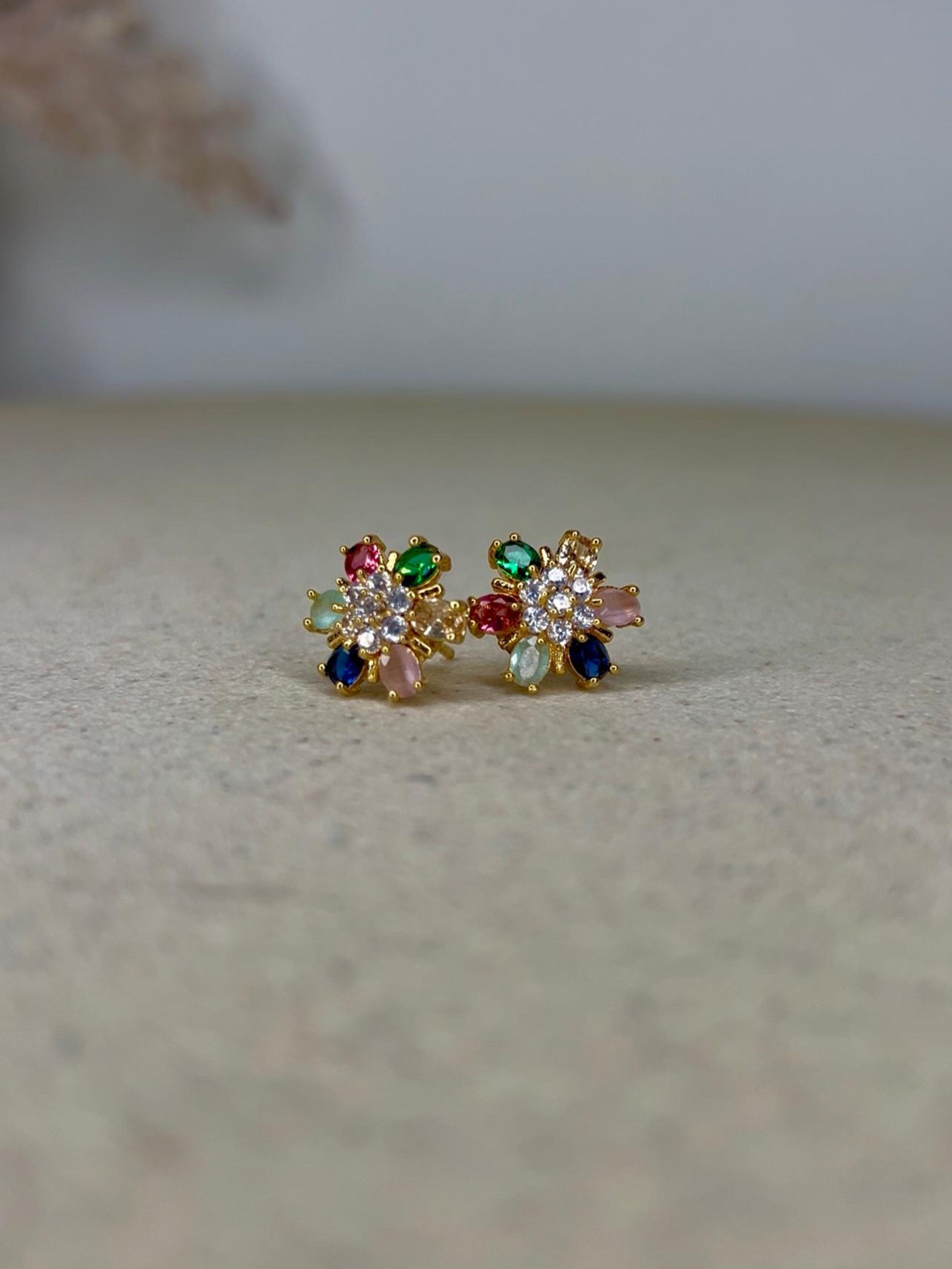 Brighten up your look with these playful yet elegant floral stud earrings. Shaped like delicate blossoms with multicoloured petals, they bring a vibrant pop of colour to any outfit. Lightweight and versatile, they're perfect for casual wear, festive looks, or as a cheerful statement piece.