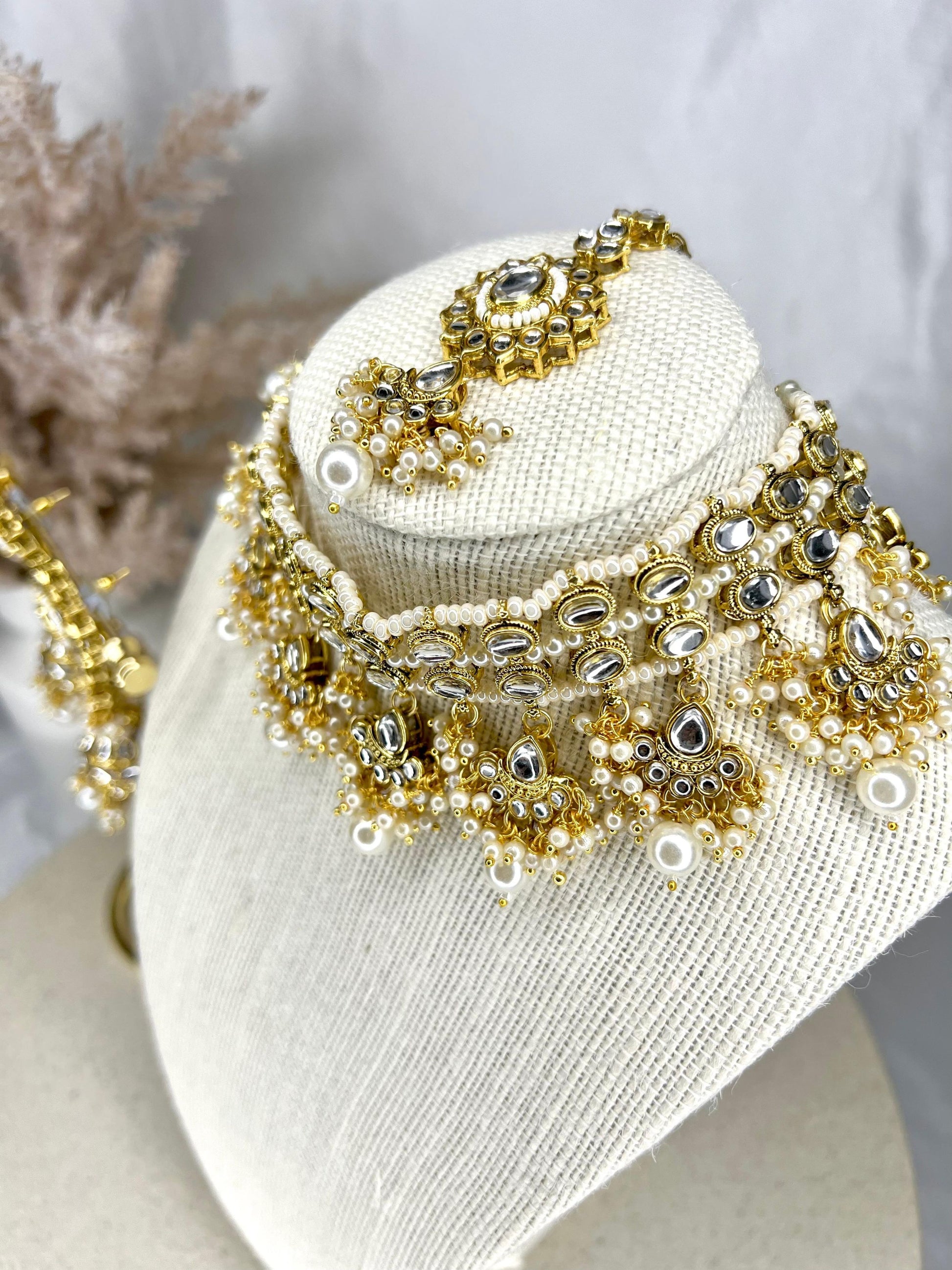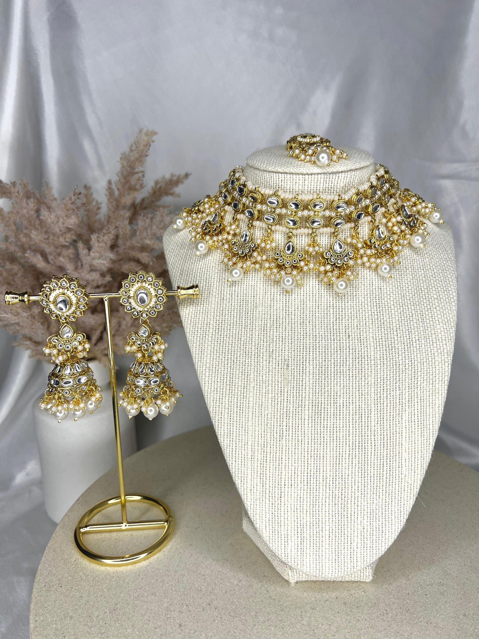 Back by popular demand, this versatile Kundan necklace set—designed to double as a choker—comes with matching hanging jhumka earrings and a tikka. Loved for its elegant detailing and timeless appeal, it’s now available in your choice of colors. A favorite for weddings and events, this set sells out fast—don’t miss out!