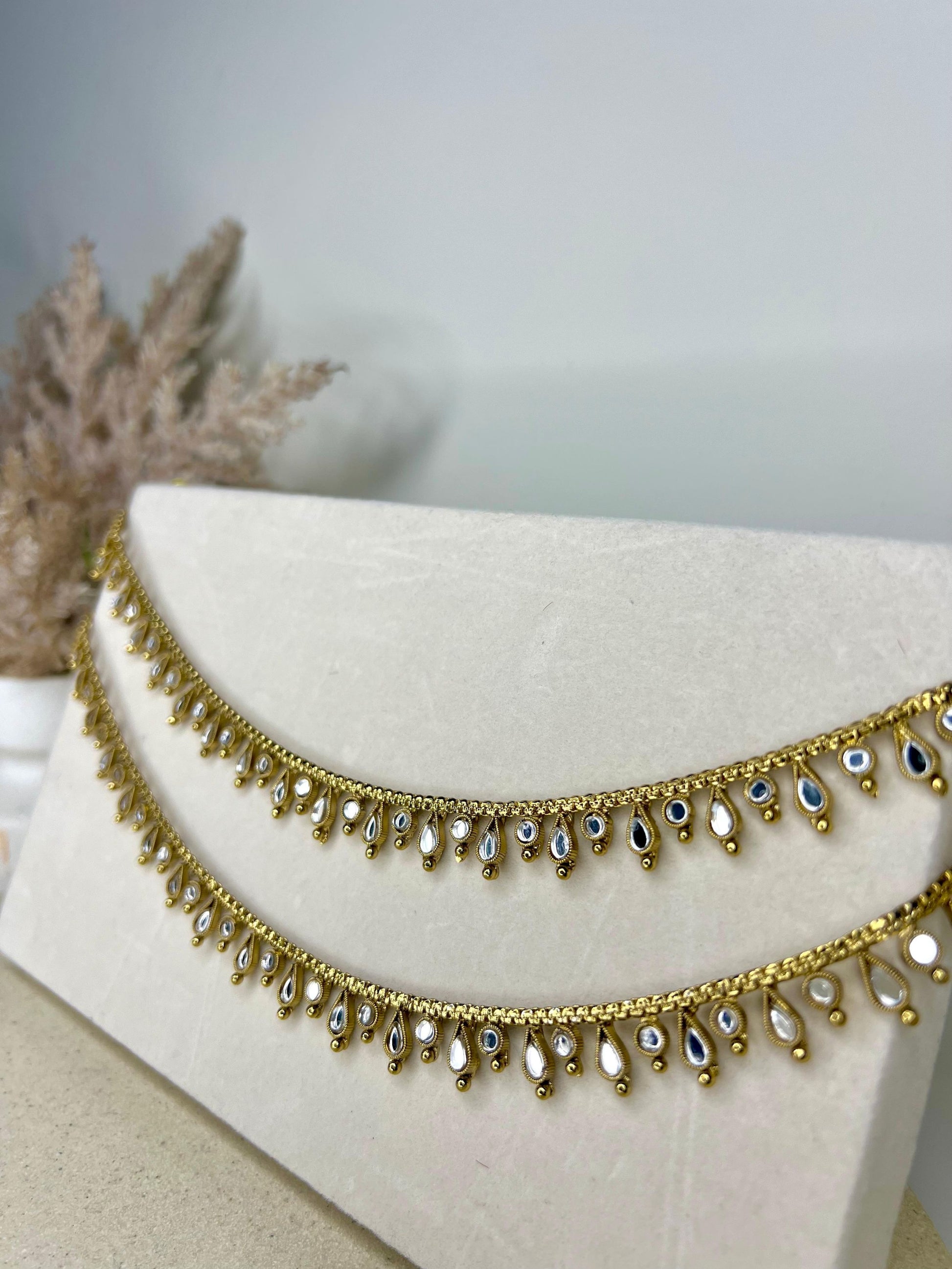 Polki Stone Gold Anklets (Pair) - Elevate your ensemble with these exquisite Polki stone gold anklets. Featuring intricate detailing and traditional uncut Polki stones, this pair exudes regal charm—perfect for weddings, festive wear, or adding a touch of heritage to your everyday look. Mirror Work Gold Anklets (Pair)Add sparkle to every step with these handcrafted mirror work gold anklets. Embellished with delicate mirror accents and traditional motifs, they beautifully reflect light and tradition—ideal for dance, celebration, or festive occasions.