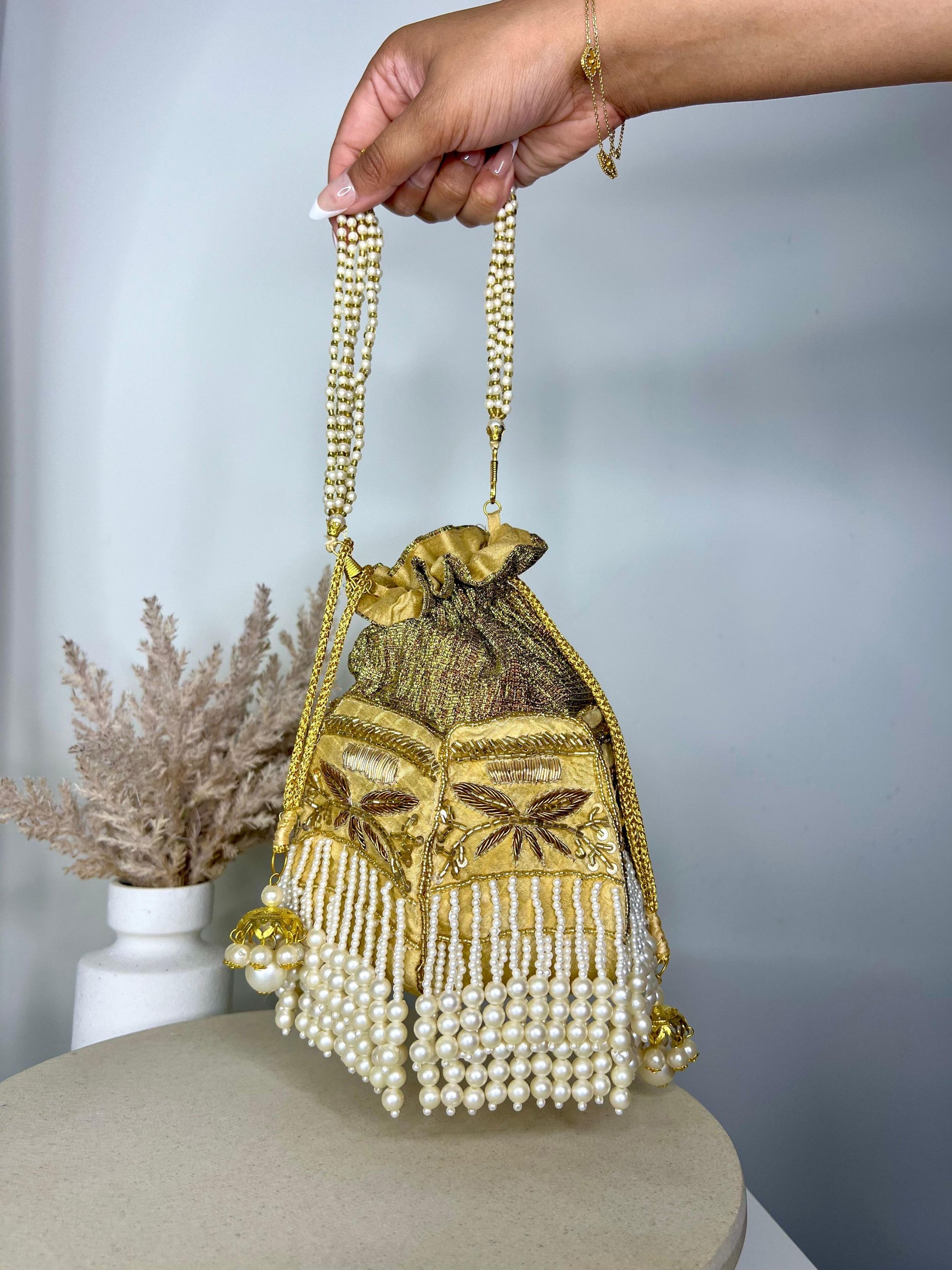 A timeless classic, this gold potli bag features intricate beading that adds a touch of shimmer to any look. Elegant and versatile, it’s the perfect accessory for weddings, festive occasions, and evenings that call for a little extra sparkle.