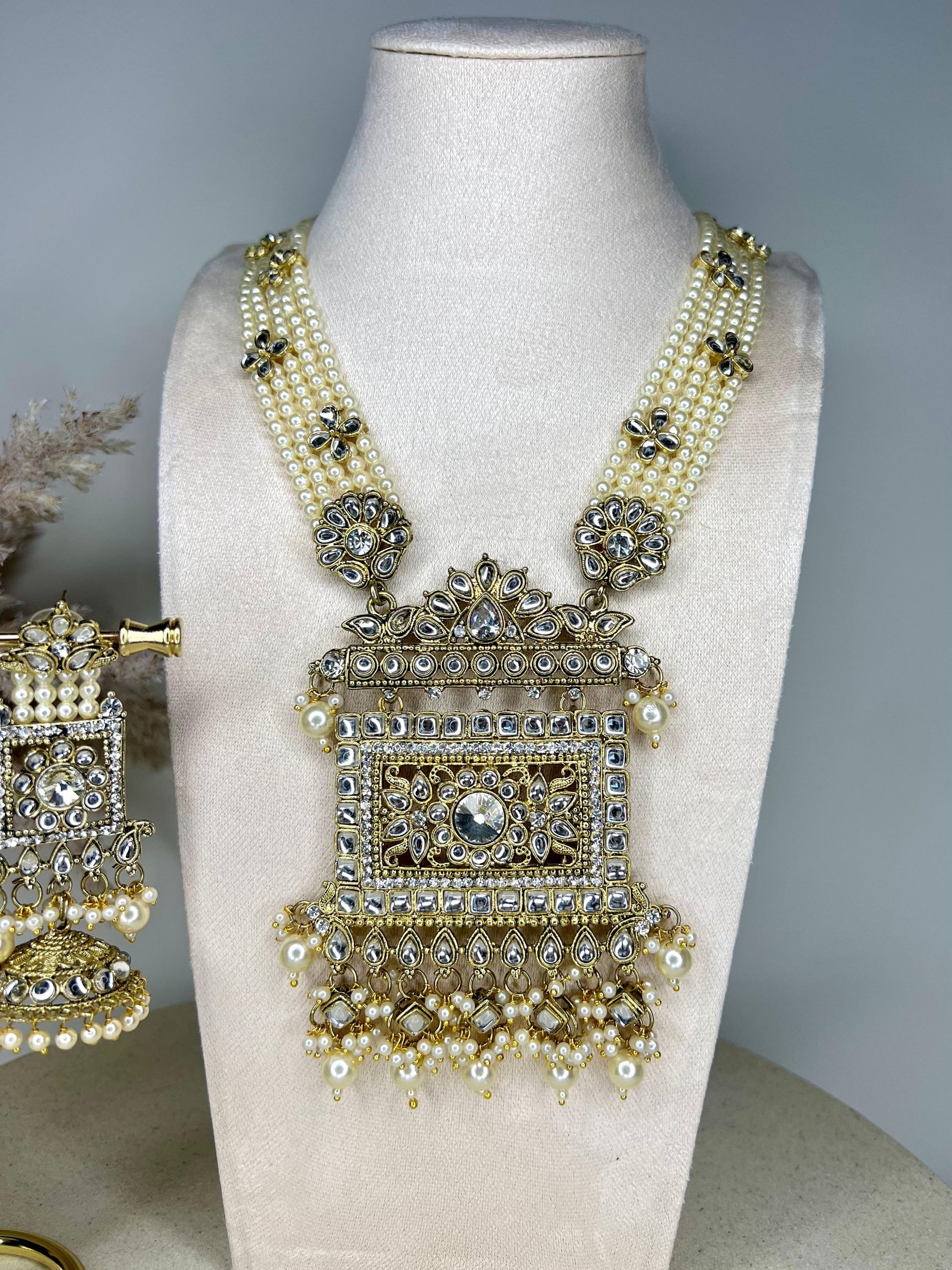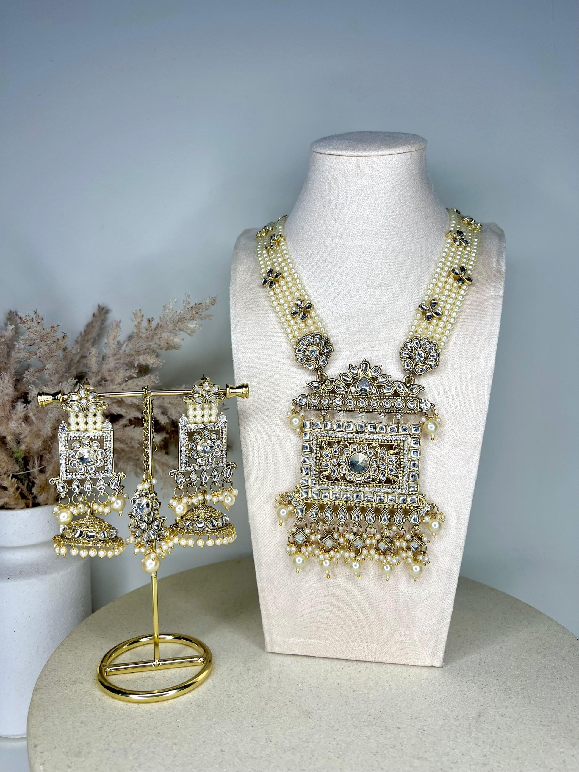 Celebrate timeless tradition with this exquisite heritage-inspired haar, accompanied by matching earrings and a tikka. Crafted to evoke classic South East Asian elegance, this set is perfect for weddings and festive occasions, offered as a beautifully unified collection for a regal, complete look.
