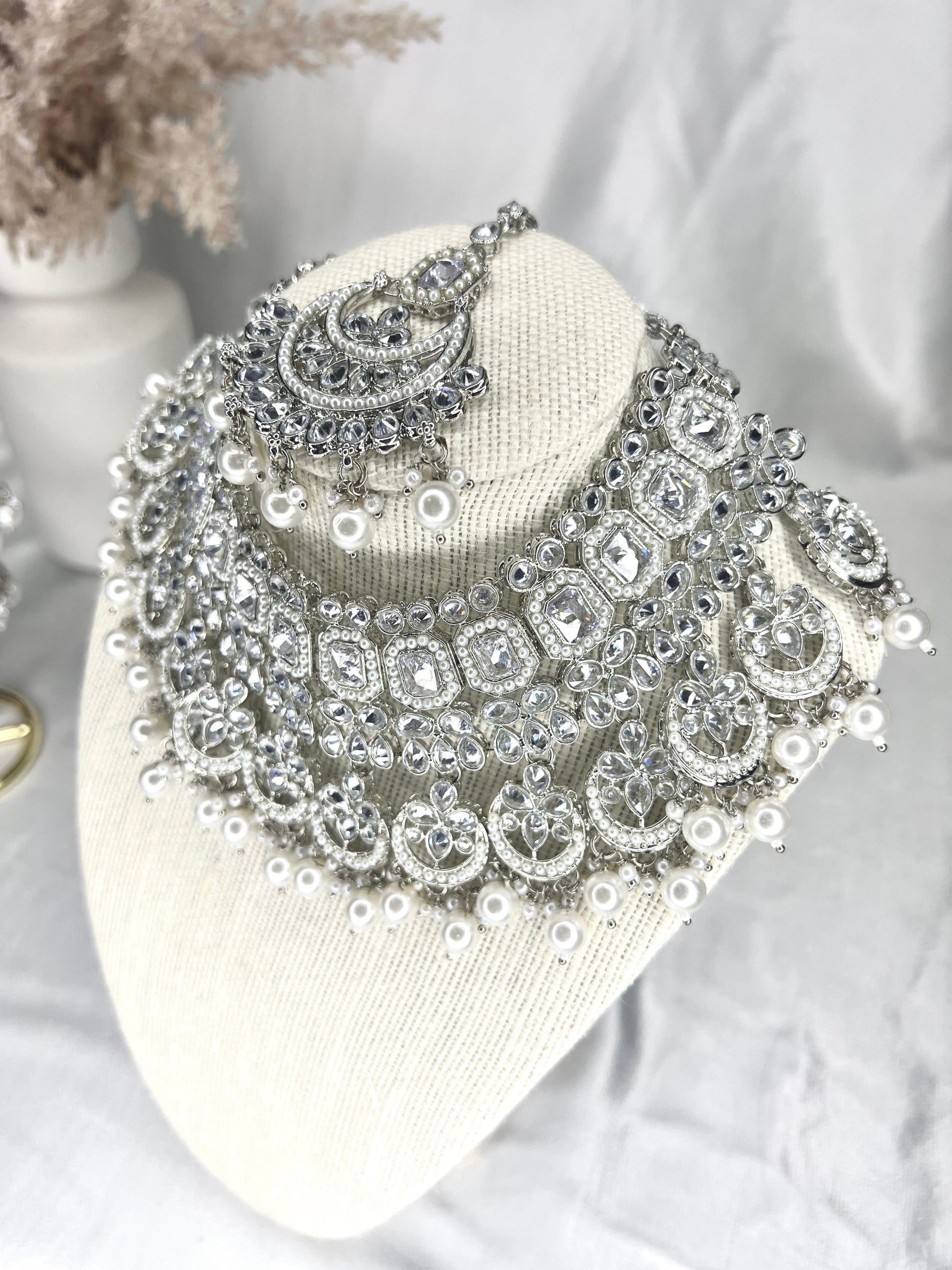 A luxurious yet affordable bridal favorite, this stunning set features intricate Polki stones and includes a matching tikka and hanging jhumka earrings. Available in gold, silver, and a vibrant multicolour option, it’s designed to suit a range of bridal looks—from classic to bold. Perfect for the modern bride who wants timeless elegance without the heavy price tag.